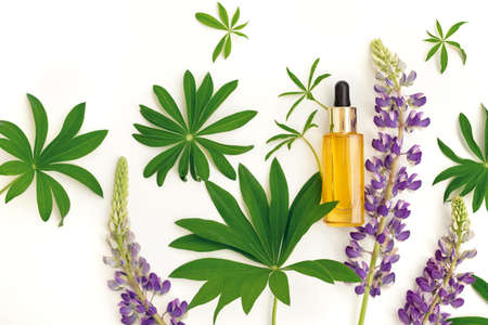 Moisturizing anti-aging oil in a glass bottle with a pipette for skin care of the face and decollete area, preventing aging, on a white background with flowers and lupine chandeliers.