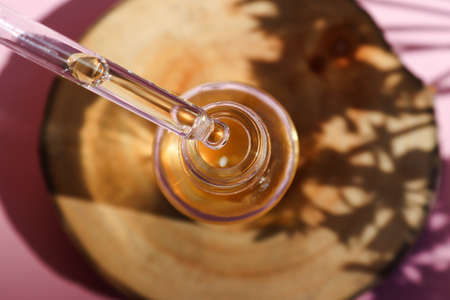 Serum oil is dripping from dropper on a wood cut close-up. Hard light with deep shadows. Selective focus. Serum skin care product. Top view, flat lay