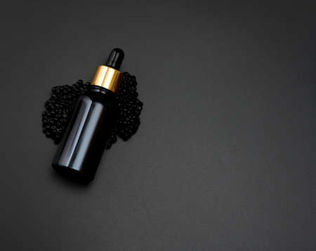 glass bottle with a pipette lies on a heap of black caviar, black background. Natural cometic. Product branding, top view