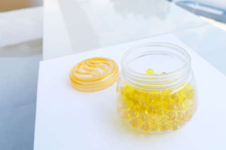 Transparent yellow capsule of drug, vitamin or fish oil.