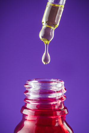 Bottle of cosmetic product and a glass pipette with a drop of cosmetic product on a purple trendy background.