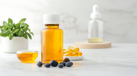 homemade oil capsules with fresh blueberry and vitamin c on white background