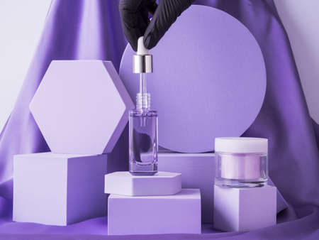 Hyaluronic acid serum bottle and anti aging cream on purple background displayed on geometric shape podiums on silk background