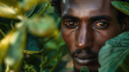 Close-up portrait of a young Oromo male farmer with an intense expression, surrounded by green corn leaves in a field.