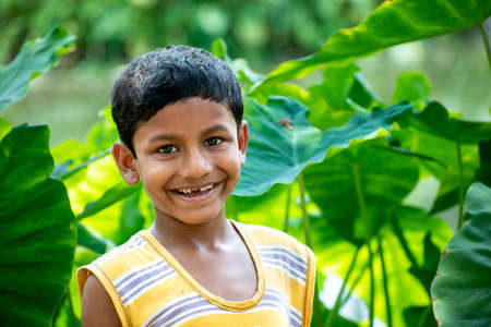 The portrait of a beautiful serene Indian child in the background of a dark green forest and he is looking at the camera in a casual dress and smiling beautifully