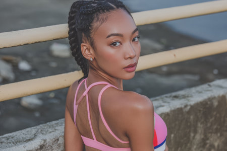 A young woman stands by a yellow railing close to the water. She wears a colorful swimsuit. Sunlight highlights her hairstyle as she looks back. The setting is outdoors during daytime.
