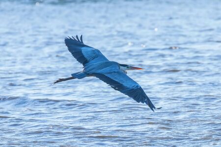 Big hungry crane bird with opened wigs flying over the big blue ocean searching for small fish to catch