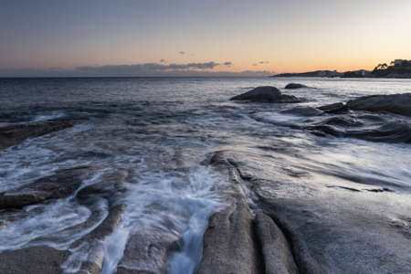 Waves washing onto the rocky coast of Corsica at Lozari as dawn breaks over Ile Rousse in the distance