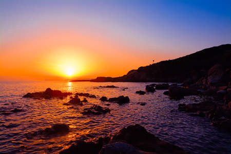 Scenic coastal sunset with orange light on island of Elba