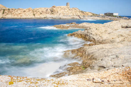Beautiful view of the southern Sardinian sea. Note the historic Saracen tower on the rock formations.