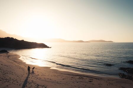 Woman and dog walk along the golden Plage de Sainte Restitude beach at sunset in the Balagne region of Corsica with the citadel of Calvi silhouetted in the distance
