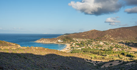 View to beautiful Algaloja old town and sandy beach with turquoise clear water, Corsica, France, Europe.