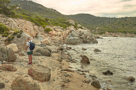 Young hiker is visiting a cliff typical of southern Sardinia during the sunset time.