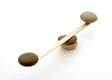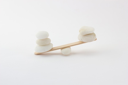 Balance concept, board on wooden top hat like balance isolated on white background.