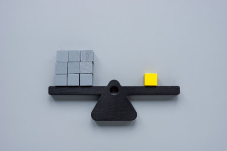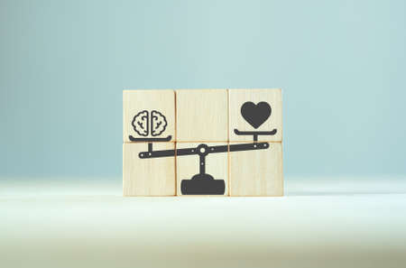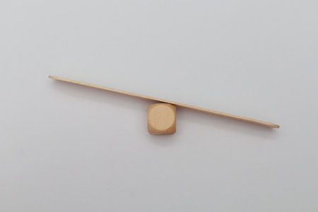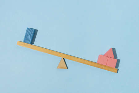 Concept of finding the right balance. Wooden cubes on seesaw