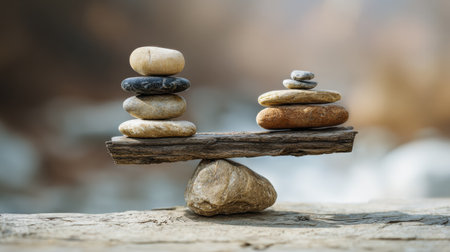 Balanced stone structures resting on wood represent fairness in technology. Each stones position shows the need for harmony and stability.