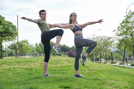 Young sporty couple stretching outdoors on the grass