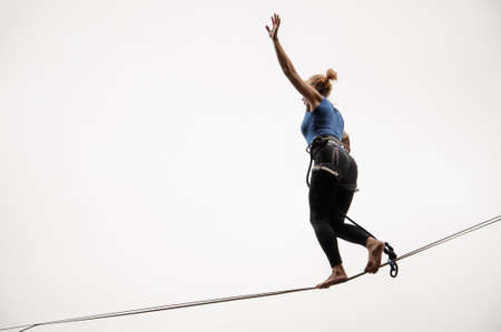 Blonde woman walking high on a slackline against the grey sky on rainy summer day