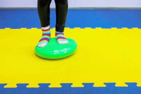 a little girl walks with her feet on a studded ball in children's center as if on a track