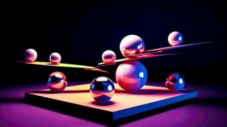 A striking arrangement of five colorful spheres on a minimalist balance beam against a warm background, showcasing modern design and artful simplicity.