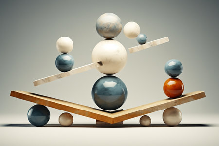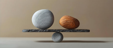 A conceptual art piece illustrating a minimalist balance theme, featuring a stylized seesaw composition with human hands delicately balancing geometric shape