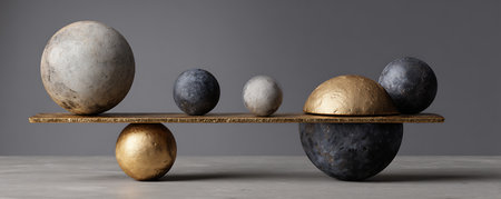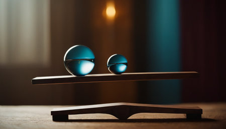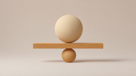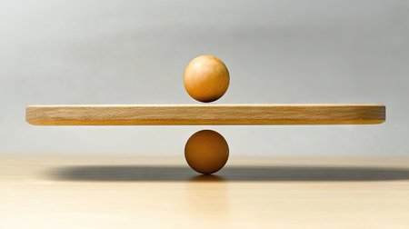 Minimalist representation of balance featuring a wooden board and two spheres. This image evokes themes of stability, symmetry, and creativity, perfect for design projects.