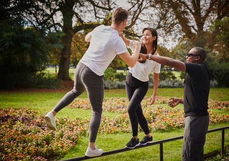 Man and woman with personal trainer balancing on park fence