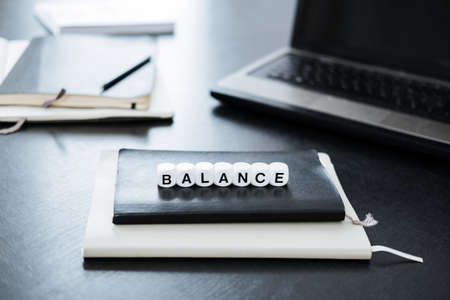 Balance in Accounting. Word Balance on background of laptop and calculator in office.