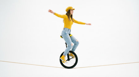 A full-length shot of a focused young woman wearing a yellow top, jeans, and a cap, riding a unicycle on a thin rope, with her arms out for balance in a white studio.