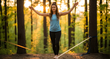 A serene young woman with arms outstretched finds her balance while walking on a slackline between two trees in a sunlit forest. The golden hour light creates a peaceful atmosphere, representing focus, mindfulness, and an active outdoor lifestyle.