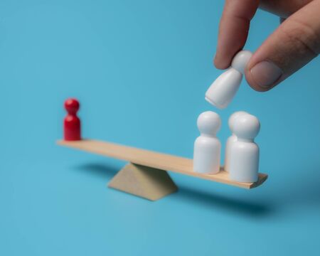 Wood people standing on scales on blue background,Conclusions of the peaceful resolution of disputes,Business opponents,Weighted decision