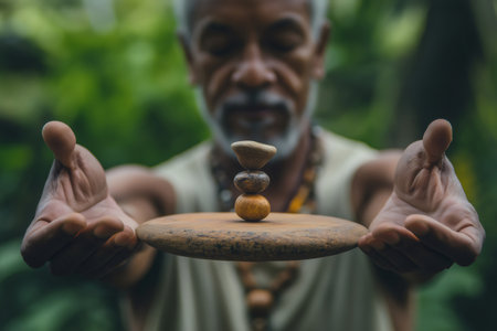 Senior shaman skillfully balancing stones on a wooden plate, surrounded by a serene tropical forest, embodying harmony and tranquility