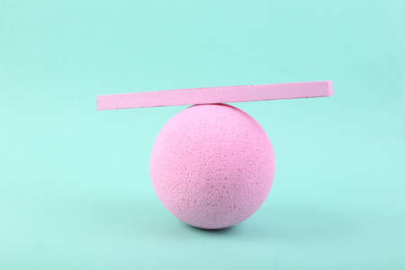 creative layout. Balancing beam on ball on blue pastel background, minimalism, abstract background