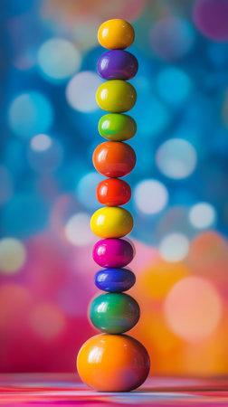 a close up of a stack of five colorful wooden balls balancing on a light surface
