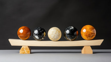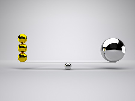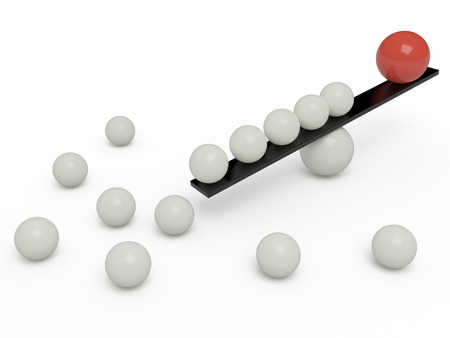 Wood seesaw with three small marble spheres in balance with one big marble sphere, busines balance or stability concept, 3D illustration