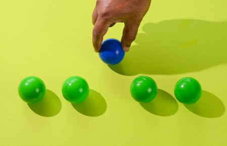 Adult person placing a blue ball between green colored balls. Concept of leadership