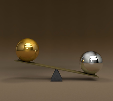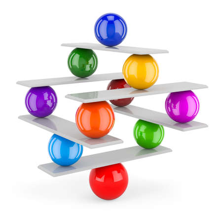 Balance concept from seesaw and colored spheres, 3D rendering isolated on white background