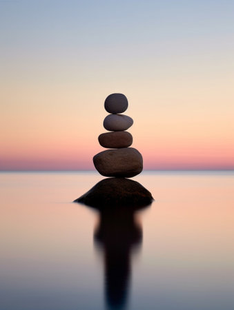 Two smooth stones are artfully balanced atop one another, mirroring in the still water below. The image features a serene composition with soft color gradients of blue and orange across the horizon. This tranquil scene could be used for various commercial purposes, including wellness and relaxation themes.