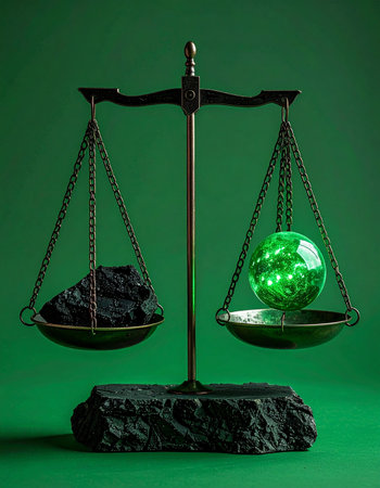 In a symbolic representation of a global crossroads, an antique scale tips decisively in favor of a glowing green sphere, representing clean, sustainable energy, over a lump of traditional coal. This powerful visual captures the critical choice between the fossil-fueled past and an innovative, environmentally conscious future, highlighting the increasing value and weight of sustainable solutions.