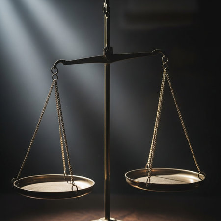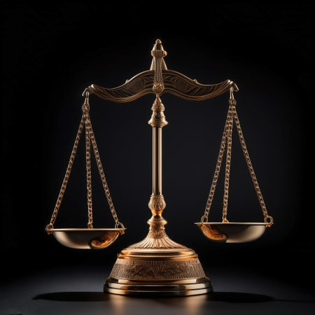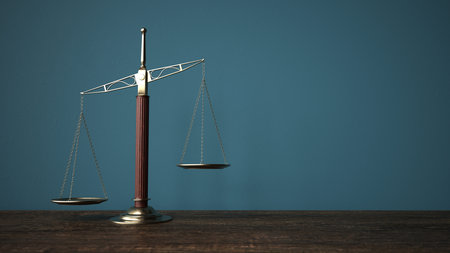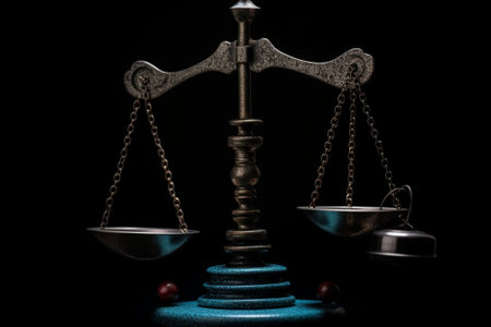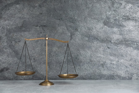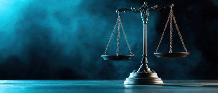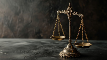 A set of balanced golden scales stands prominently against a dark background, representing justice and fairness in a legal environment, evoking thoughts on law and morality