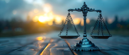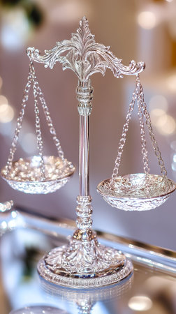 This captivating image features a close-up view of justice scales with a glimmering background. It symbolizes fairness and balance in the realm of law.