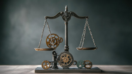 A vintage scale showcases a balance of justice, featuring gears and metalwork, set against a softly lit, moody backdrop.
