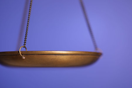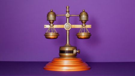 A stunning depiction of golden scales of justice set against a vibrant purple backdrop, symbolizing balance and equality in the legal system and ethics.