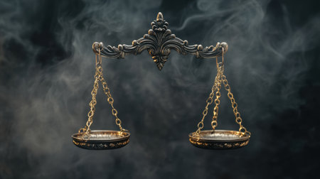 This image features an ornate antique bronze balance scale suspended by chains, surrounded by a mystical smoke atmosphere, symbolizing justice and equality.