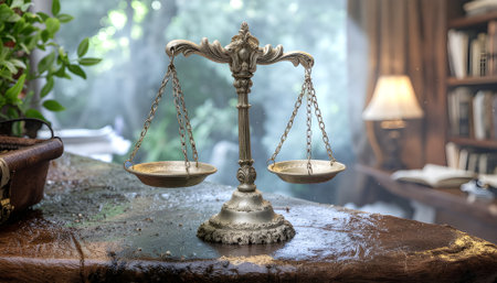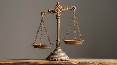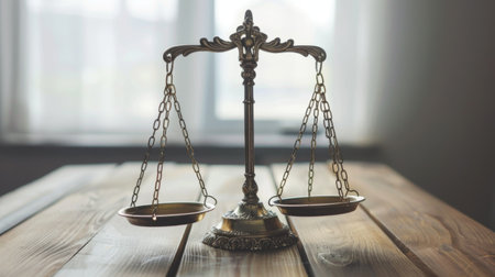 Ornate brass scales of justice stand as a symbol of fairness and law on a vintage wooden desk in a classic study environment