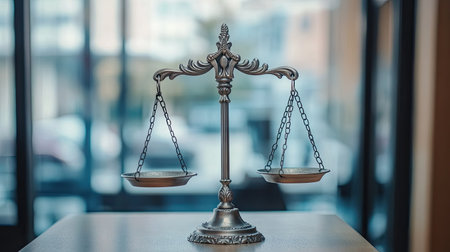 This stunning image features a meticulously crafted balance scale, representing justice and fairness, set against a beautifully blurred modern background to enhance focus.