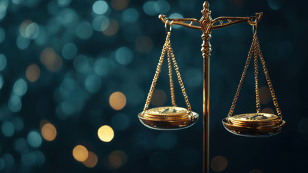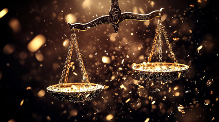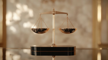 Golden balance scale symbolizes justice and fairness, elegantly positioned on reflective surface. warm lighting enhances serene atmosphere, evoking sense of balance and harmony