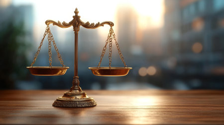 Golden scales of justice sit on a wooden desk, casting shadows.