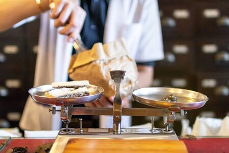 The doctor of traditional medicine weight, dried herbs on vintage balance scale at old medicine herbs shop.