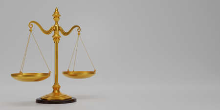 3D render Gold brass balance scale isolated on white background. Scales of justice, Symbol of law and justice concept. Copy space for texts. 3d rendering illustration.